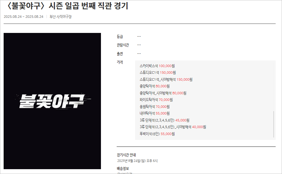 불꽃야구 시즌 7 직관은 사직야구장에서 25년 8월 24일 일요일 오후 6시에 열립니다. 불꽃파이터즈와 부산고 야구부와 경기를 치르게 되었습니다.