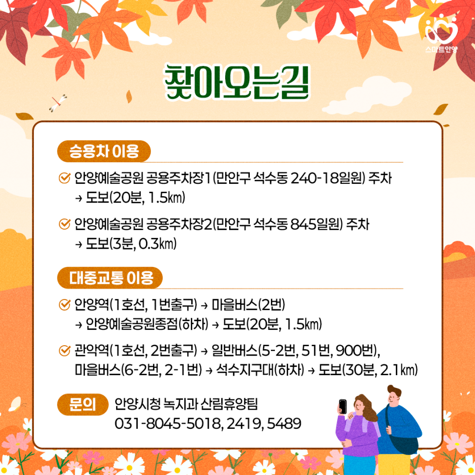 - 안양역(1호선) → 마을버스 2번 → 예술공원 종점 → 도보 20분