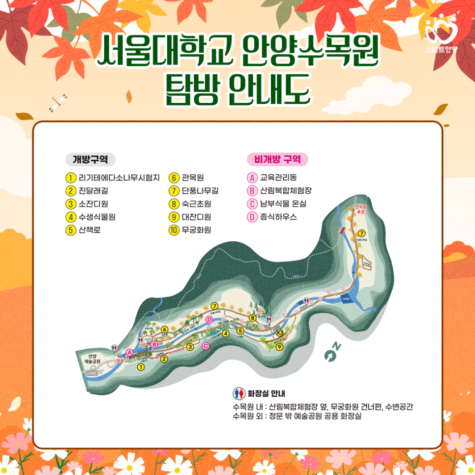 서울대 안양수목원은 단순한 공원이 아닌 체험형 산림 공간으로, 누구나 자연을 주제로 한 자신만의 루트를 만들 수 있습니다. 계절마다 풍경이 달라 재방문하면 또 다른 힐링을 느낄 수 있어요 🍁🌸❄️