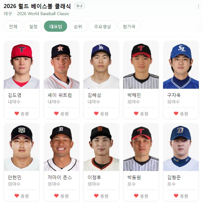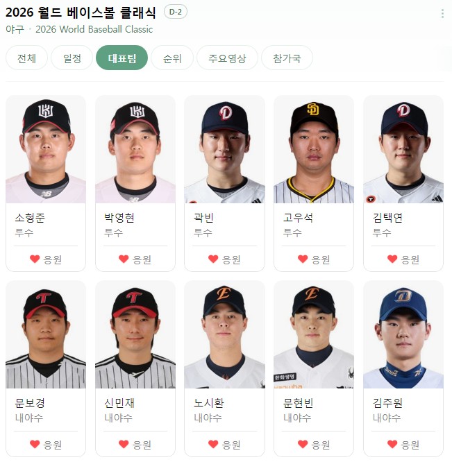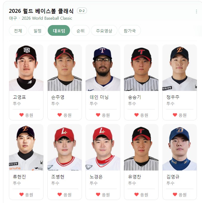 - 류현진 (한화 이글스 / 투수): 16년 만에 태극마크를 달았습니다. "나만 잘하면 된다"는 에이스다운 책임감을 보이고 있으며, 미국 심판들의 스트라이크 존을 꿰뚫는 노련한 제구력으로 체코전이나 중요한 승부처에 선발 등판할 예정입니다.