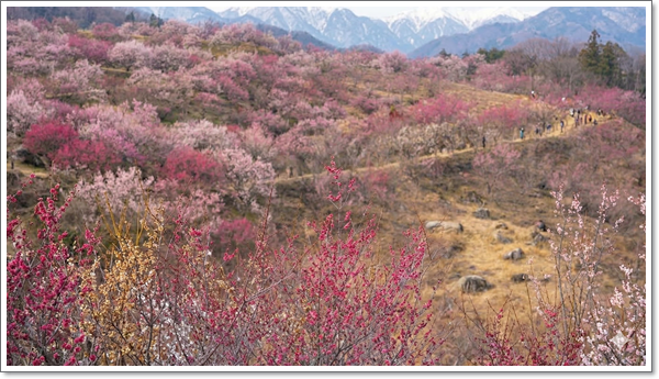 매화는 품종에 따라 개화 시기가 다르지만, 진주 매화숲의 매력인 홍매화는 일반 백매화보다 일주일 정도 빠르게 만개합니다.