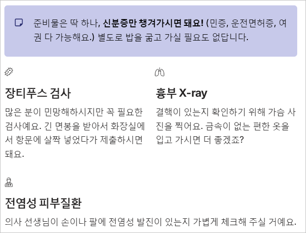 - 전염성 피부질환: 의사 선생님이 손이나 팔에 전염성 발진이 있는지 가볍게 체크해 주실 거예요.