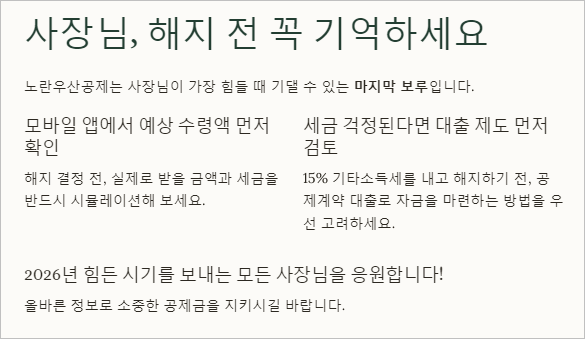 - 예상 금액 조회: 해지 버튼을 누르기 전, 내가 받을 금액과 떼일 세금을 미리 계산해 볼 수 있습니다. (이 단계에서 마음을 바꾸시는 사장님들이 많아요!)