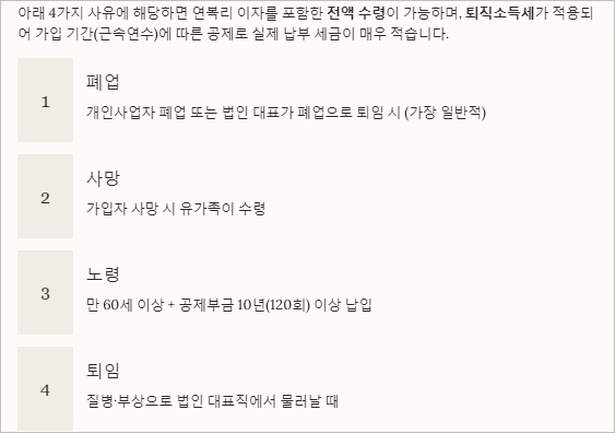 노란우산공제는 원래 '퇴직금' 목적이기 때문에, 아래 4가지 사유에 해당하면 그동안 쌓인 연복리 이자를 포함해 전액을 수령하며 세금 혜택도 유지됩니다.