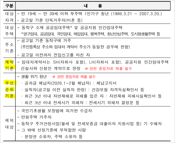 - 주소지: 공고일 이전까지 동작구에 전입신고를 마친 자 (임대차 계약서와 주민등록 주소지가 동일해야 함)