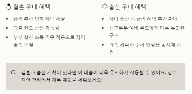 자녀를 출산하면 금리 혜택이 더 커지기도 한대요. 그래서 신혼부부나 예비 부모에게 완전 유리할 수 있어요.