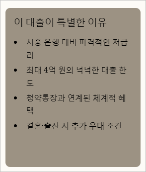 주택 구매 부담을 덜어주면서 안정적인 미래를 계획할 수 있도록 돕는 게 이 대출의 목적이에요. 그러니까 내 집 마련을 꿈꾼다면 이 기회를 놓치면 안 되는 더라고요. 미래를 위한 투자라고도 볼 수 있어요.